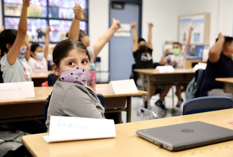 Students of Montrara Ave. Elementary School attend their in-person class in Los Angeles, California, the United States, on Aug. 16, 2021. (Xinhua)
