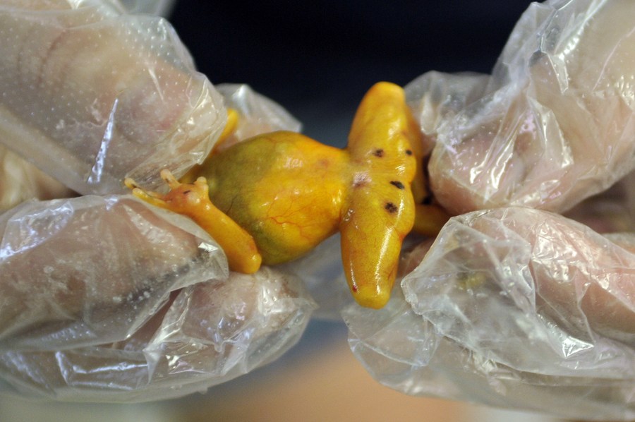 Biologist Heidi Ross holds a golden frog at the reproduction center of El Nispero Zoo, during the celebration of the Golden Frog's Day, in Anton valley, in Code province, Panama, on Aug. 14, 2012. (Xinhua/Mauricio Valenzuela)
