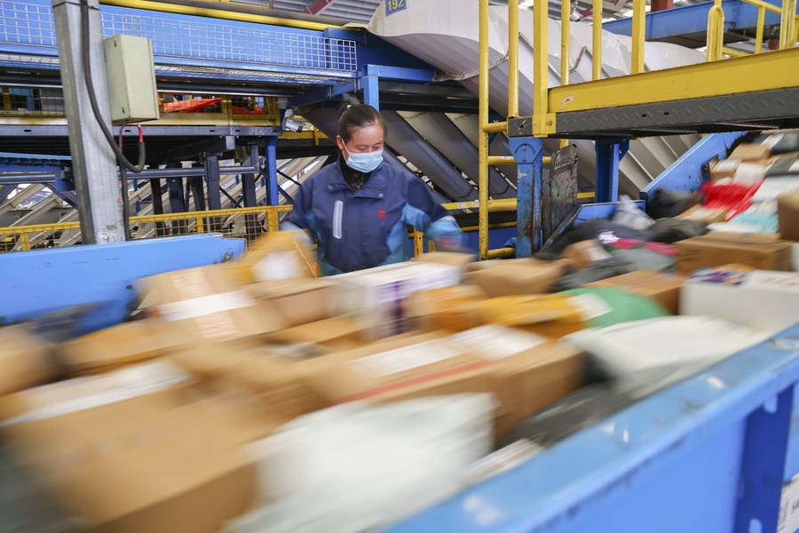 A staff member sorts packages at a logistics center in Linyi, east China's Shandong Province, Nov. 11, 2022. (Photo by Xu Chuanbao/Xinhua)