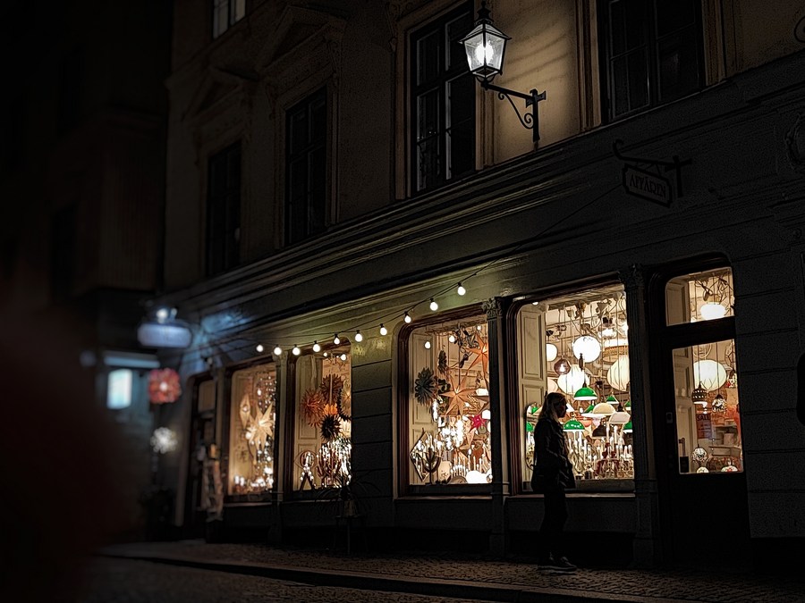 This photo taken on Oct. 28, 2022 shows a pedestrian looking into Hogberg's lighting shop in Stockholm's Old Town, Sweden. (Photo by Patrick Ekstrand/Xinhua)