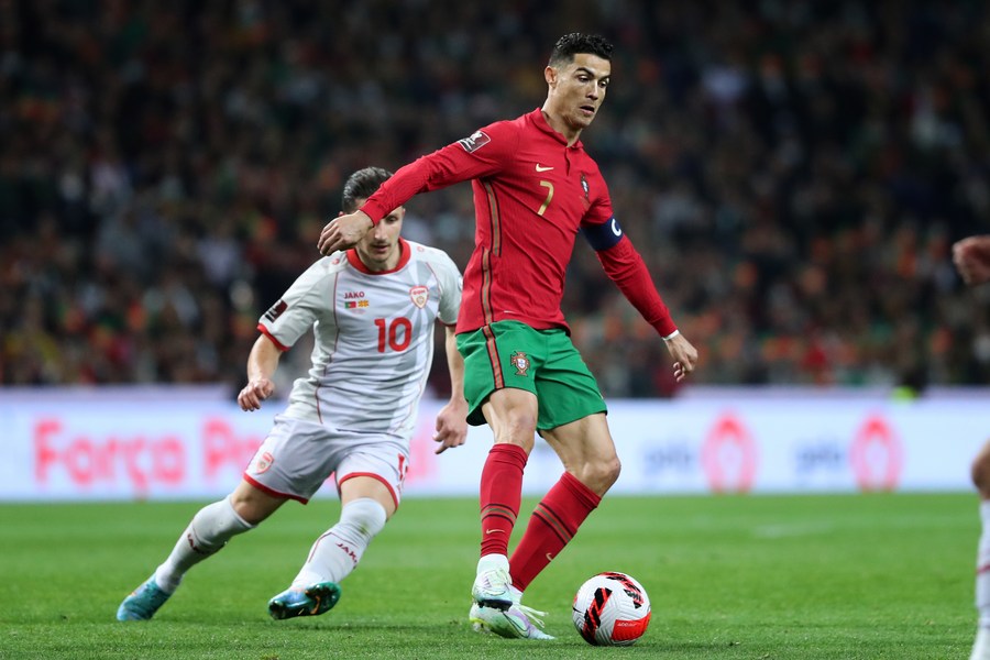Portugal forward Cristiano Ronaldo (R) in action during the 2022 FIFA World Cup qualifier against North Macedonia at the Dragao stadium in Porto, Portugal, on March 29, 2022. (Photo by Pedro Fiuza/Xinhua)