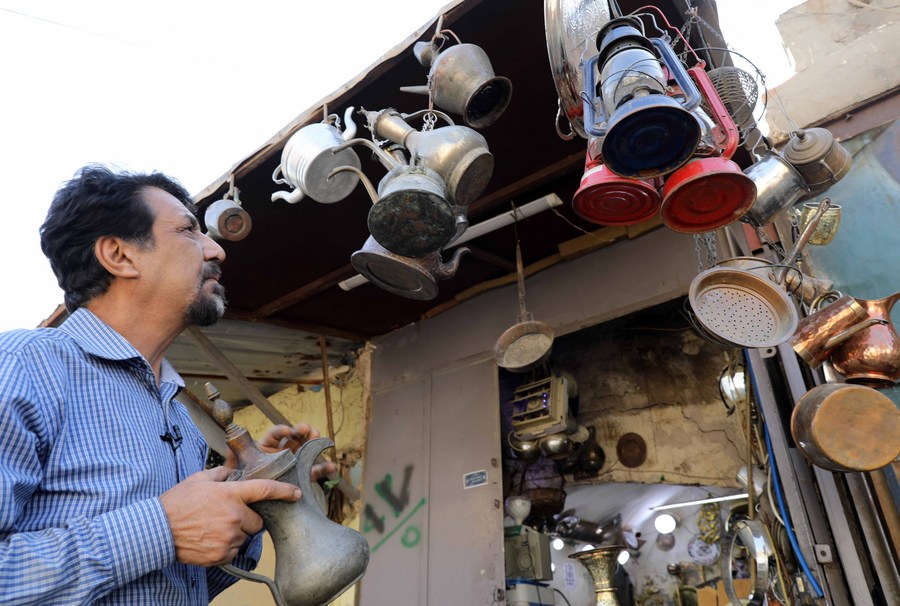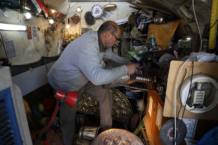 Hussein Ali al-Taie works on a copper artifact in his shop in Baghdad, Iraq, on Nov.14, 2022. (Xinhua/Khalil Dawood).