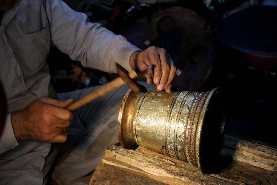 Hussein Ali al-Taie works on a copper jar in his shop in Baghdad, Iraq, on March 16, 2022. (Xinhua/Khalil Dawood)■