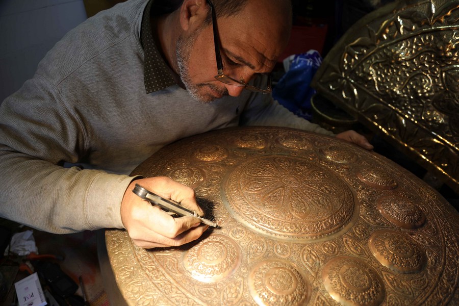 Hussein Ali al-Taie makes engravings on a copper shield in his shop in Baghdad, Iraq, on March 16, 2022. (Xinhua/Khalil Dawood)