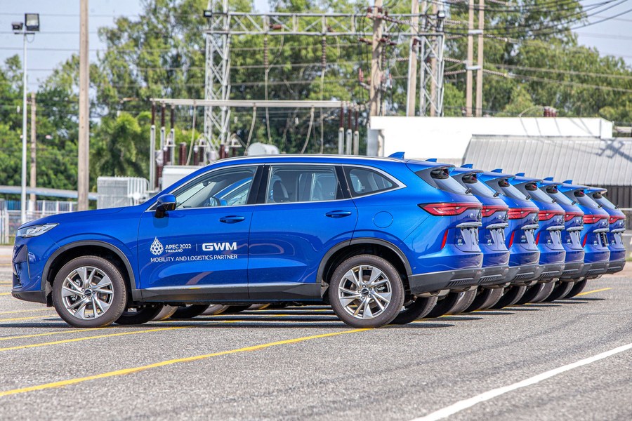 This photo taken on Nov. 1, 2022 shows the APEC official designated Haval H6 hybrid vehicles of Chinese auto brand GWM in Rayong, Thailand. (Xinhua/Wang Teng)