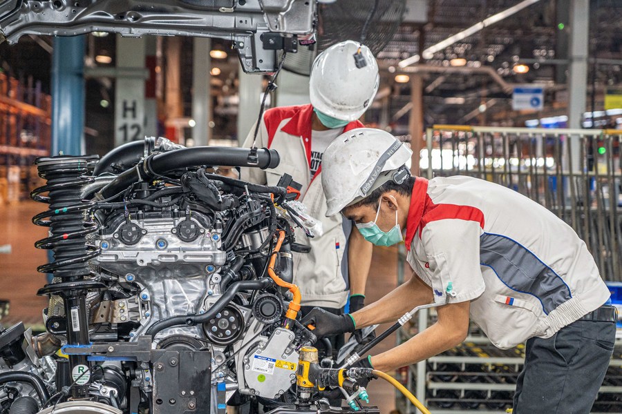 Workers work at the GWM factory in Rayong, Thailand, on Nov. 8, 2022. (Xinhua/Lin Hao)