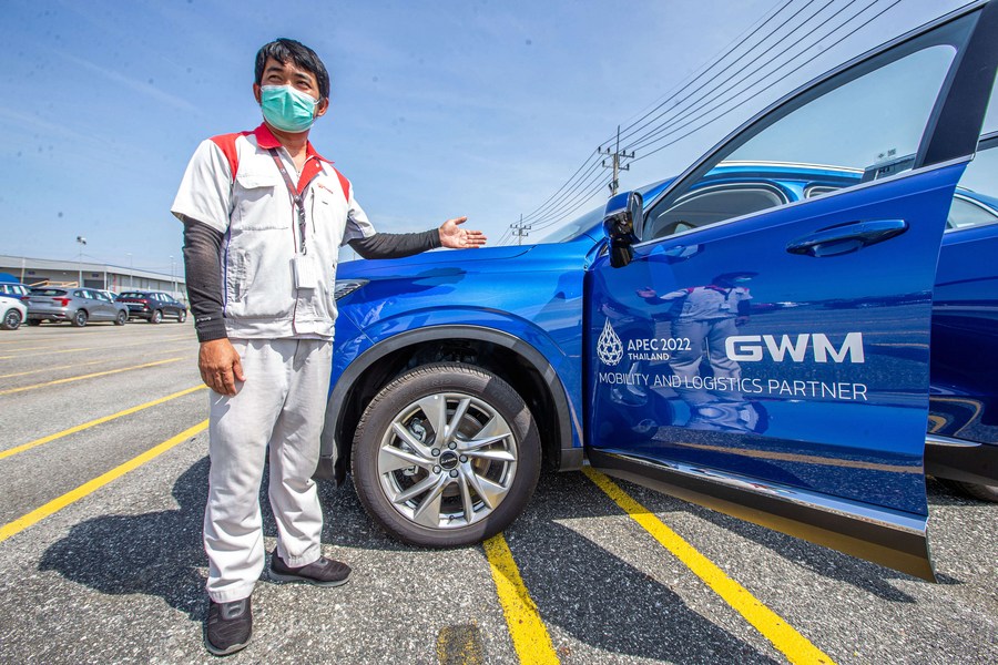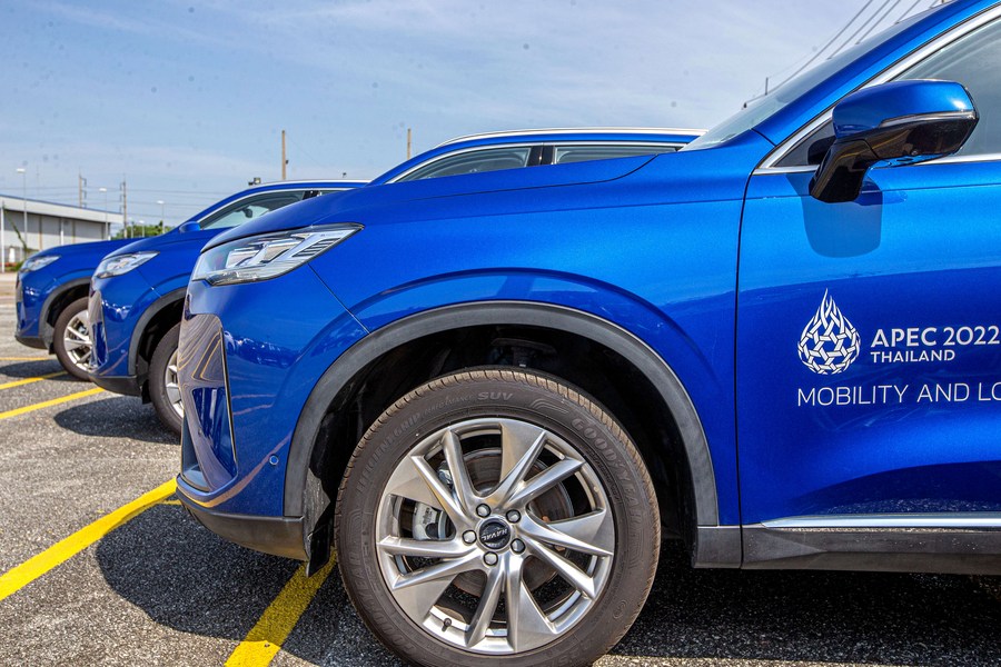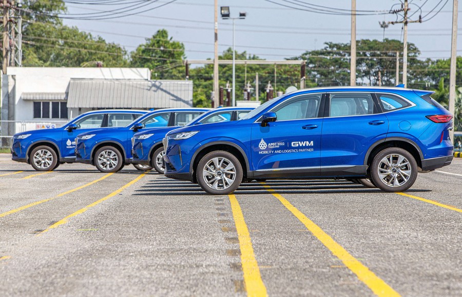 Photo taken on Nov. 1, 2022 shows the APEC official designated Haval H6 hybrid vehicles of Chinese auto brand GWM in Rayong, Thailand. (Xinhua/Wang Teng)