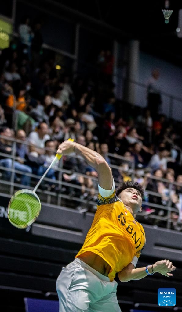 Ikhsan Leonardo Imanuel Rumbay of Indonesia hits a return during men's singles quarterfinal match against Lu Guangzu of China at the BWF Australian Open 2022 in Sydney, Australia, Nov. 18, 2022. (Photo by Hu Jingchen/Xinhua)