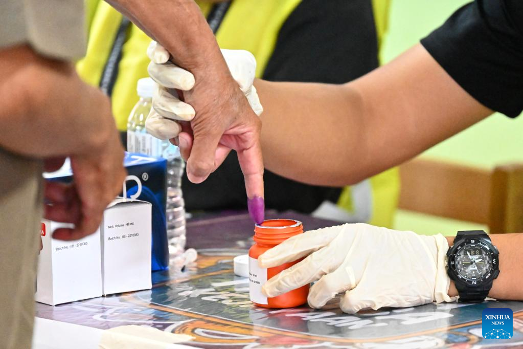 A voter dips a finger into ink before casting the ballot during the general election in Bera of Pahang state, Malaysia, Nov. 19, 2022. Malaysia kicked off its national polls on Saturday, with voters streaming to voting centers to elect representatives who will form the next government. (Xinhua/Zhu Wei)