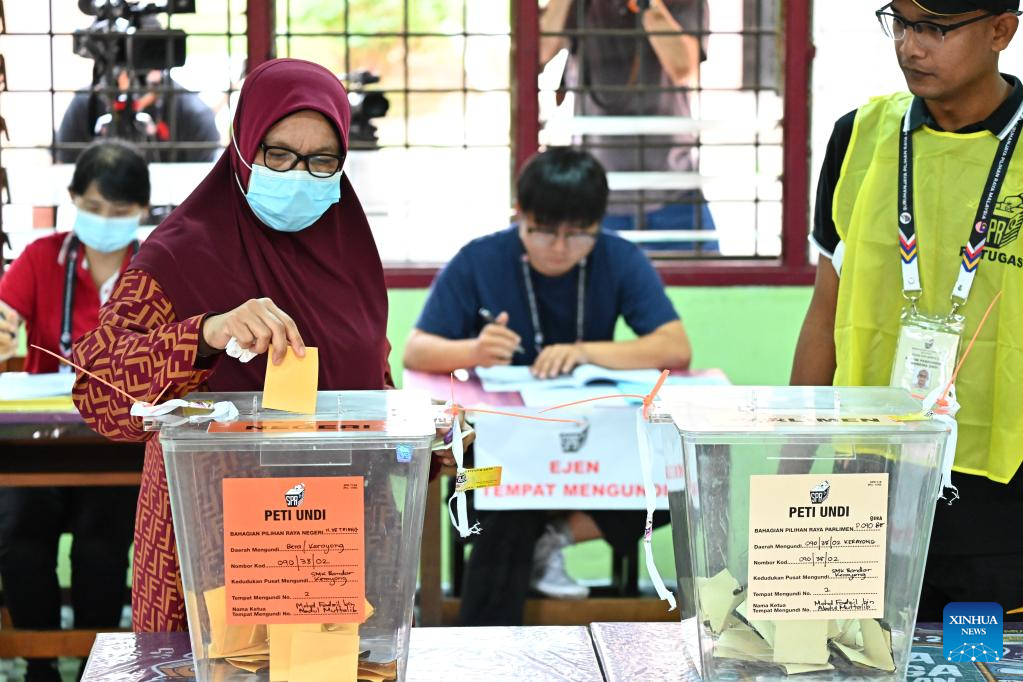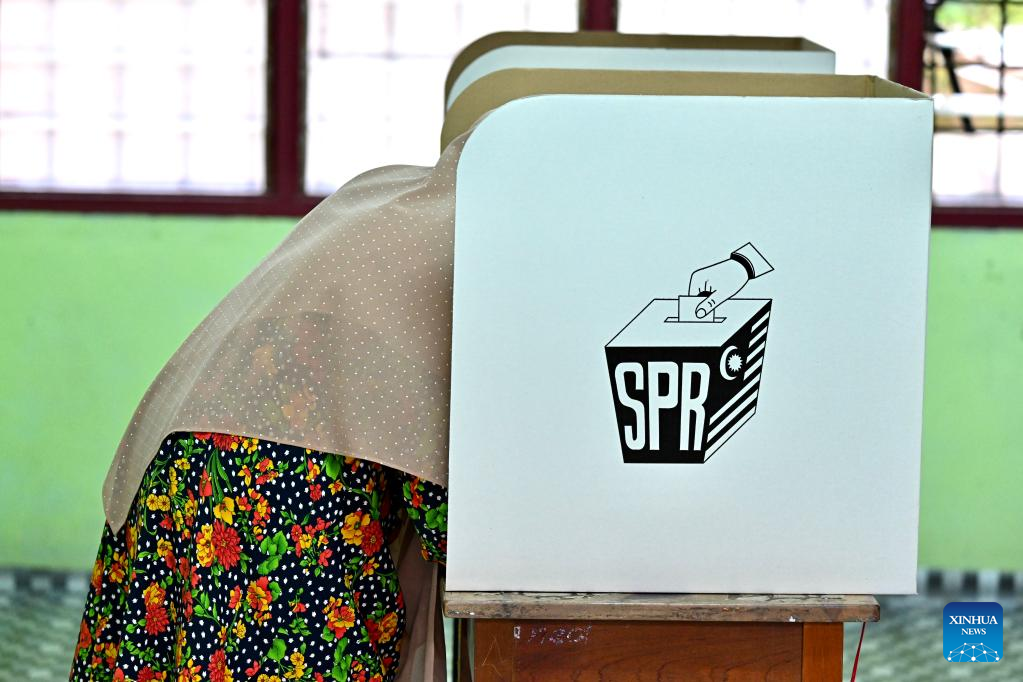 A voter casts the ballot during the general election in Bera of Pahang state, Malaysia, Nov. 19, 2022. Malaysia kicked off its national polls on Saturday, with voters streaming to voting centers to elect representatives who will form the next government. (Xinhua/Zhu Wei)
