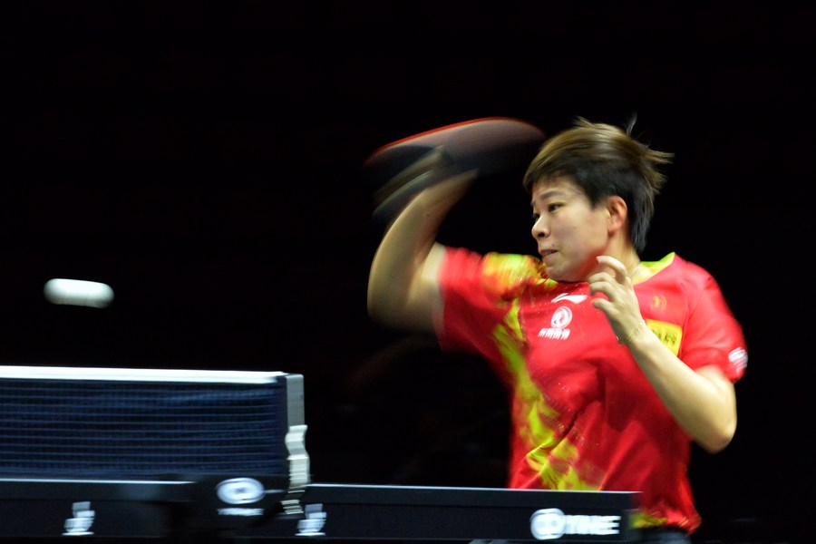 Wang Yidi of China hits a return during the women's singles final against Mima Ito of Japan at the Asian Cup 2022 in Bangkok on Nov. 19, 2022. (Xinhua/Rachen Sageamsak)