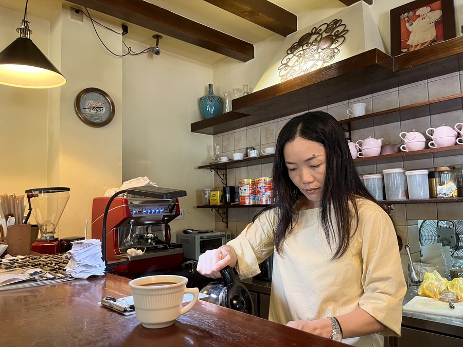 Shen Hongmei makes coffee in the cafe run by her and her husband in Xinglong Township of Wanning, south China's Hainan Province, Nov. 17, 2022. (Xinhua/Chen Ziwei)