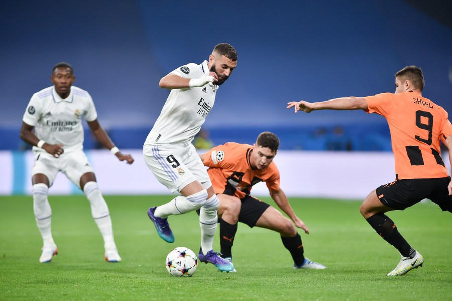 Karim Benzema (2nd L) of Real Madrid competes during a UEFA Champions League Group F football match against FC Shakhtar Donetsk of Ukraine in Madrid, Spain, Oct. 5, 2022. (Photo by Gustavo Valiente/Xinhua)