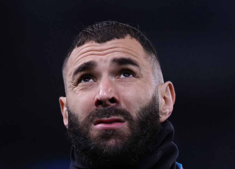 Karim Benzema of Real Madrid warms up before the UEFA Champions League round of 16 first leg match between Paris Saint-Germain and Real Madrid at the Parc des Princes in Paris, France, Feb. 15, 2022. (Xinhua/Gao Jing)