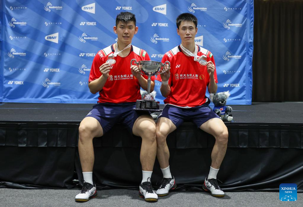 Liu Yuchen/Ou Xuanyi (R) of China pose for photos after the awarding ceremony of men's doubles final match of BWF Australian Open 2022 against Ong Yew Sin/Teo Ee Yi of Malaysia in Sydney, Australia, Nov. 20, 2022. (Xinhua/Bai Xuefei)