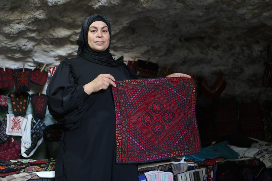 A woman displays her work at an exhibition for Palestinian homemade products inside an archaeological cave in Khirbet Susiya, south of the West Bank city of Hebron, on Oct. 8, 2022. (Photo by Mamoun Wazwaz/Xinhua)