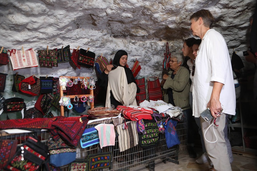 People visit an exhibition for Palestinian homemade products inside an archaeological cave in Khirbet Susiya, south of the West Bank city of Hebron, on Oct. 8, 2022. (Photo by Mamoun Wazwaz/Xinhua)