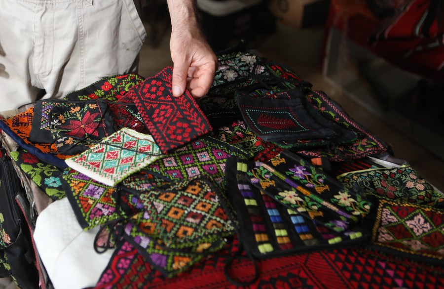 This photo taken on Oct. 8, 2022 shows homemade products which were displayed at an exhibition inside an archaeological cave in Khirbet Susiya south of the West Bank city of Hebron. (Photo by Mamoun Wazwaz/Xinhua)