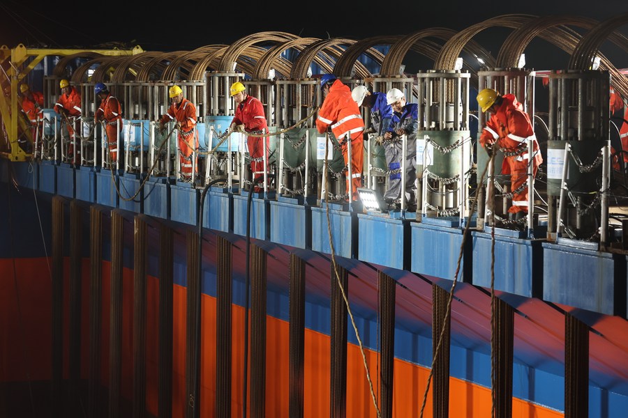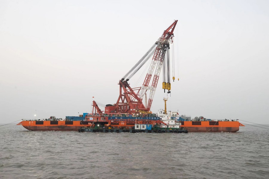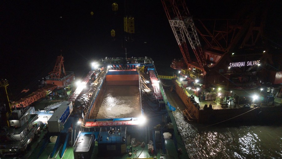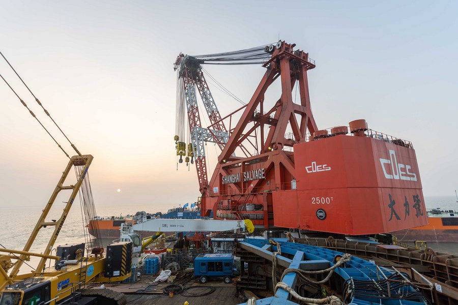 This photo taken on Nov. 20, 2022 shows a view of the salvage operation of the Yangtze No. 2 Ancient Shipwreck in Shanghai, east China. (Xinhua/Wang Xiang)