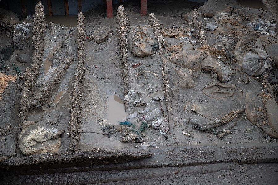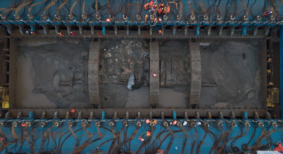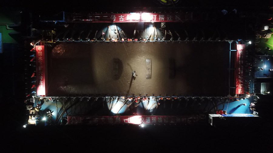 This photo taken on Nov. 21, 2022 shows a view of the salvage operation of the Yangtze No. 2 Ancient Shipwreck in Shanghai, east China. (Xinhua/Wang Xiang)