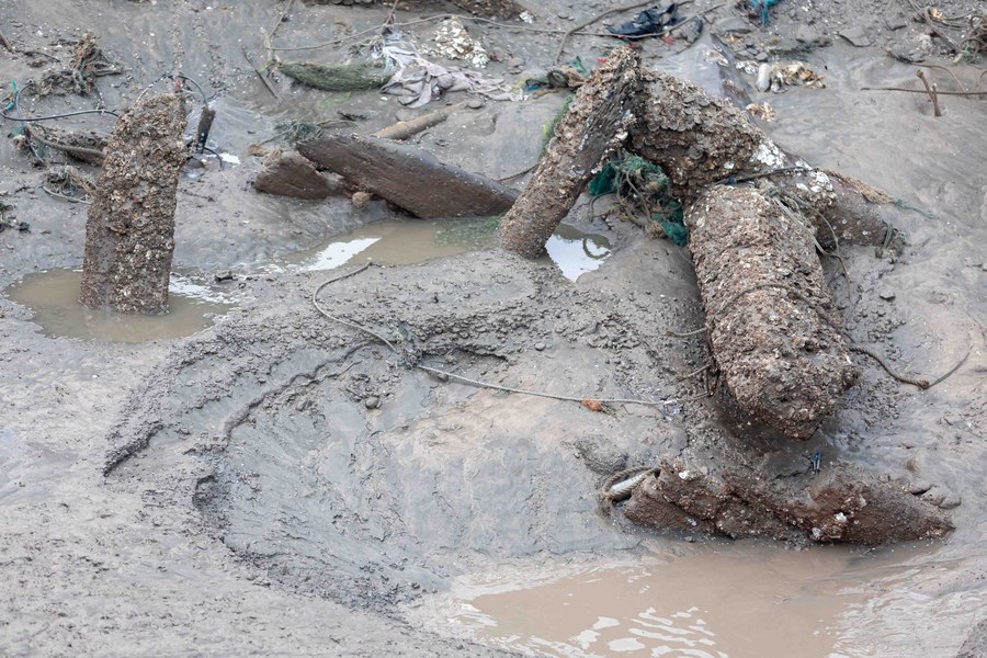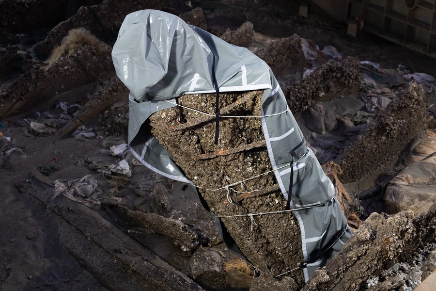This photo taken on Nov. 21, 2022 shows a part of the Yangtze No. 2 Ancient Shipwreck lifted out of waters in Shanghai, east China. (Xinhua/Wang Xiang)