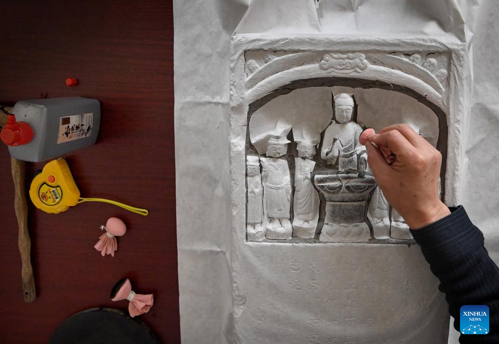 This photo taken on Nov. 17, 2022 shows a part of a high relief rubbing by Li Renqing. Making rubbings for tablet inscriptions is a craft with a history of over 1,000 years in China, invented as a way to copy documents even before the art of printing. Upgrading the traditional rubbing craft which can only be applied to flat surface, Li Renqing, born in 1963 in Xinyang of central China's Henan Province, has been working for a whole life on rubbings of high relief cultural relics, making the once impossible task a mature craft.