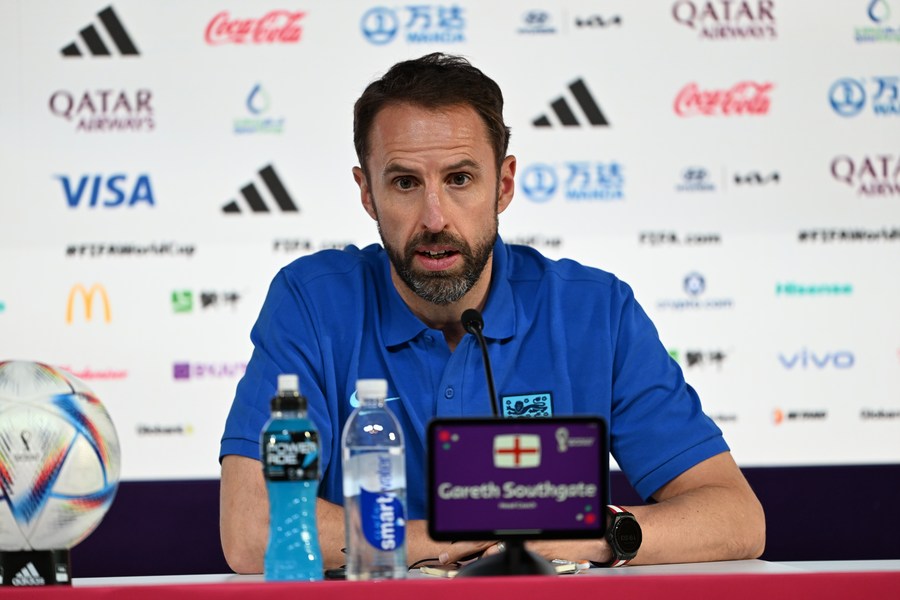England's head coach Gareth Southgate attends a press conference one day ahead of the group B match against Iran at the 2022 Qatar FIFA World Cup in Doha, Qatar, Nov. 20, 2022. (Xinhua/Xia Yifang)