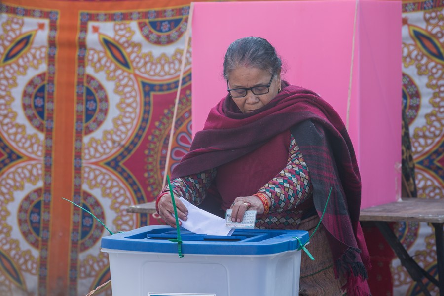 A woman casts her ballot during the general elections in Lalitpur, Nepal, Nov. 20, 2022. (Photo by Hari Maharjan/Xinhua)