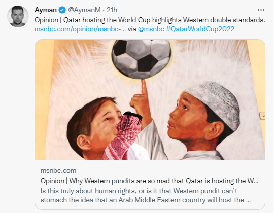 Screenshot shows a post tweeted by MSNBC anchor Ayman Mohyeldin on Nov. 20, 2022 about Western double standards on the 2022 Qatar World Cup.