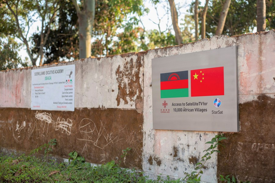 Photo taken on Sept. 10, 2020 shows a plate with information about satellite television project by China Aid in Blantyre, Malawi. (Xinhua/Joseph Mizere) ■