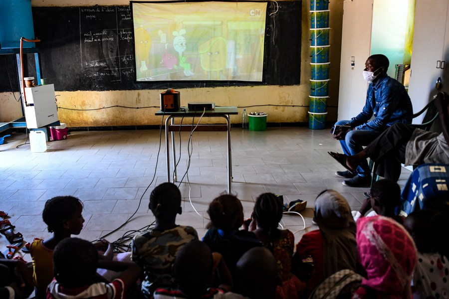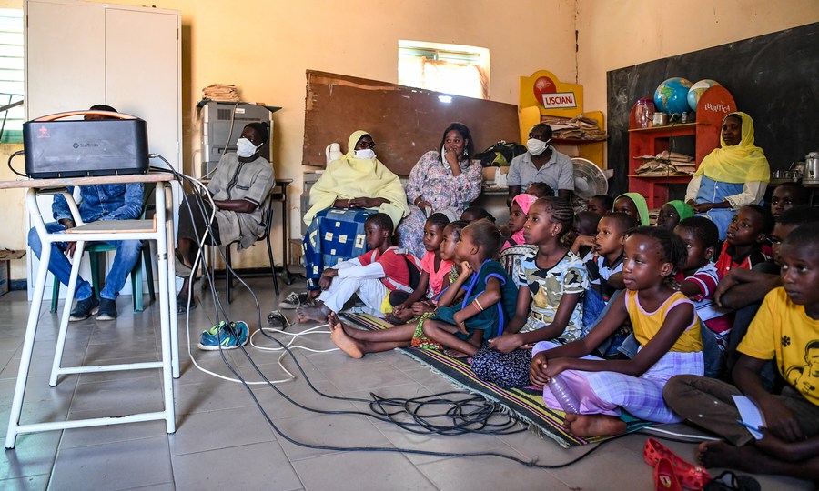 Students watch satellite television via projector provided by Chinese media company StarTimes under a China-funded project at a school on the outskirts of Dakar, Senegal, Nov. 22, 2021. The satellite TV project is one of the fruits of the resolutions of the 2015 summit of the Forum on China-Africa Cooperation held in Johannesburg, South Africa, in which the Chinese government pledged to provide satellite TV in 10,000 African villages. (Xinhua/Li Yan)