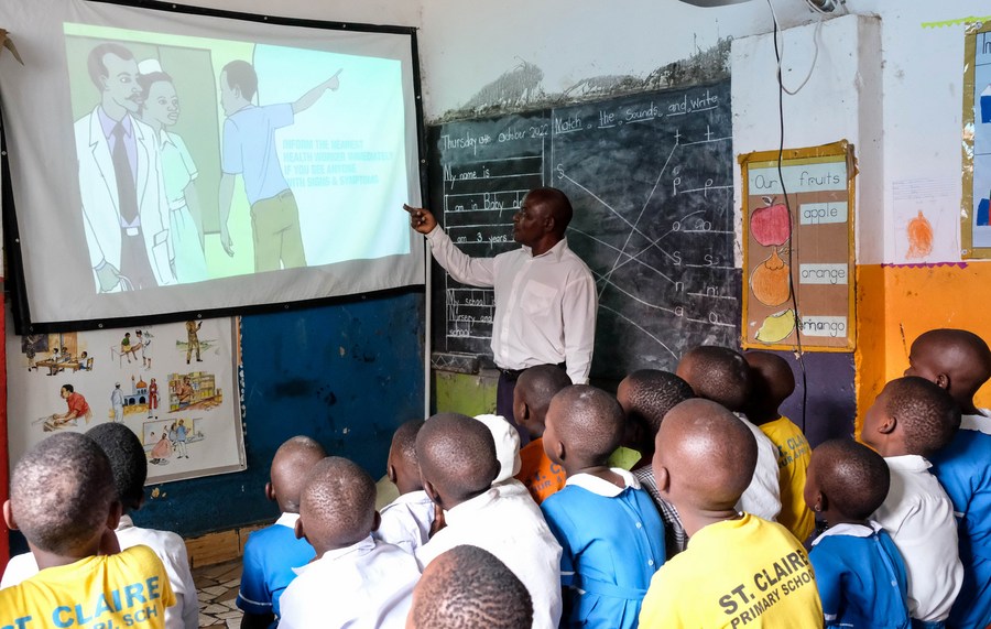 Pupils attend class about Ebola using a StarTimes projector at St. Claire Primary School in Kampala, Uganda, Oct. 13, 2022. The "Access to Satellite TV for 10,000 African Villages" project in Uganda is implemented by Chinese satellite television, StarTimes. This project is one of the fruits of the resolutions of the Forum on China-Africa Cooperation Johannesburg Summit held in 2015 in South Africa. (Photo by Hajarah Nalwadda/Xinhua)