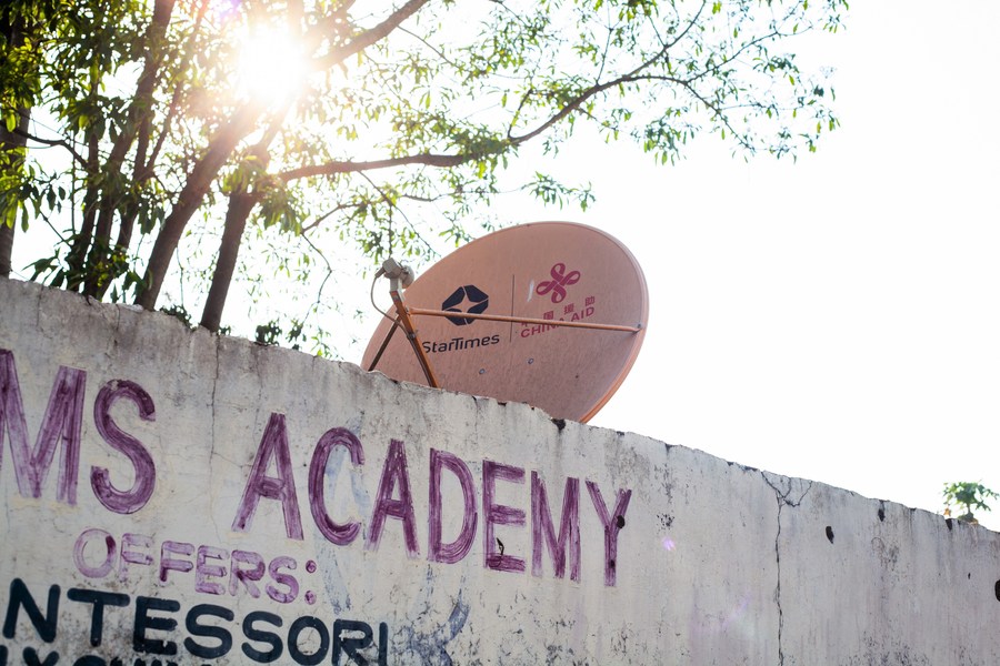 Photo taken on Sept. 10, 2020 shows a satellite dish on top of a school building in Blantyre, Malawi. In 2018, the Malawi government with assistance from the Chinese government launched a satellite television project aimed at reaching 500 rural communities. (Xinhua/Joseph Mizere)