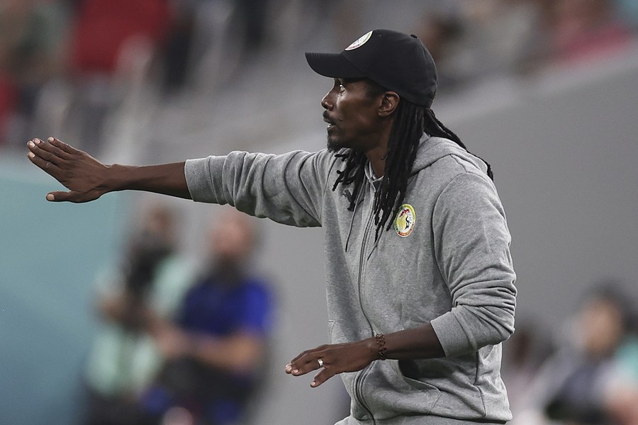 Aliou Cisse gestures to his players during Senegal's Group A defeat against the Netherlands at the 2022 FIFA World Cup at Al Thumama Stadium in Doha, Qatar, Nov. 21, 2022. (Xinhua/Xu Zijian)