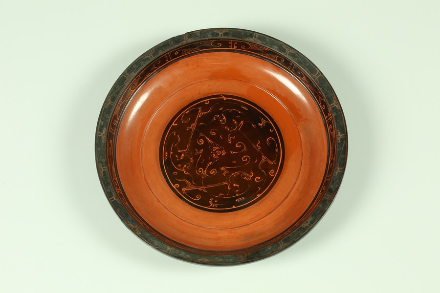 Undated photo shows a lacquered plate decorated with dragon patterns, unearthed from the tomb of the Marquis of Haihun, on display at an exhibition in the Jiangxi Provincial Museum. (Xinhua)