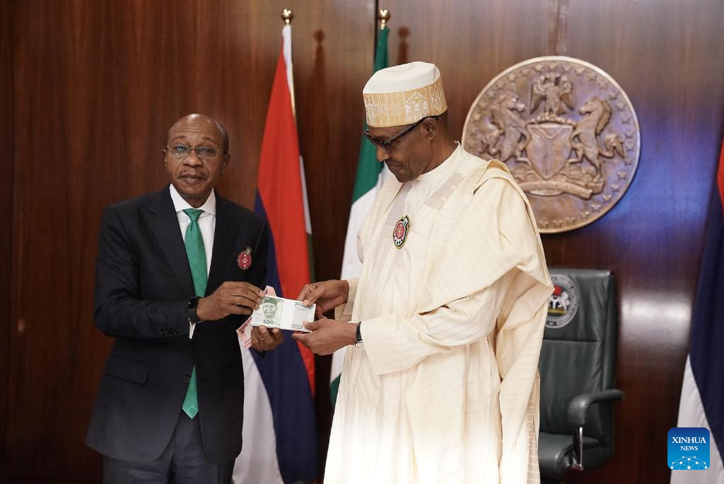 Nigerian President Muhammadu Buhari(R) and Godwin Emefiele, the Governor of the Central Bank of Nigeria, present the re-designed banknotes of Nigerian naira in Abuja, Nigeria, on Nov. 23, 2022. Nigerian President Muhammadu Buhari on Wednesday launched the re-designed local banknotes to control the supply of the Nigerian naira, the local currency of the most populous African country. (Photo by Sodiq/Xinhua)