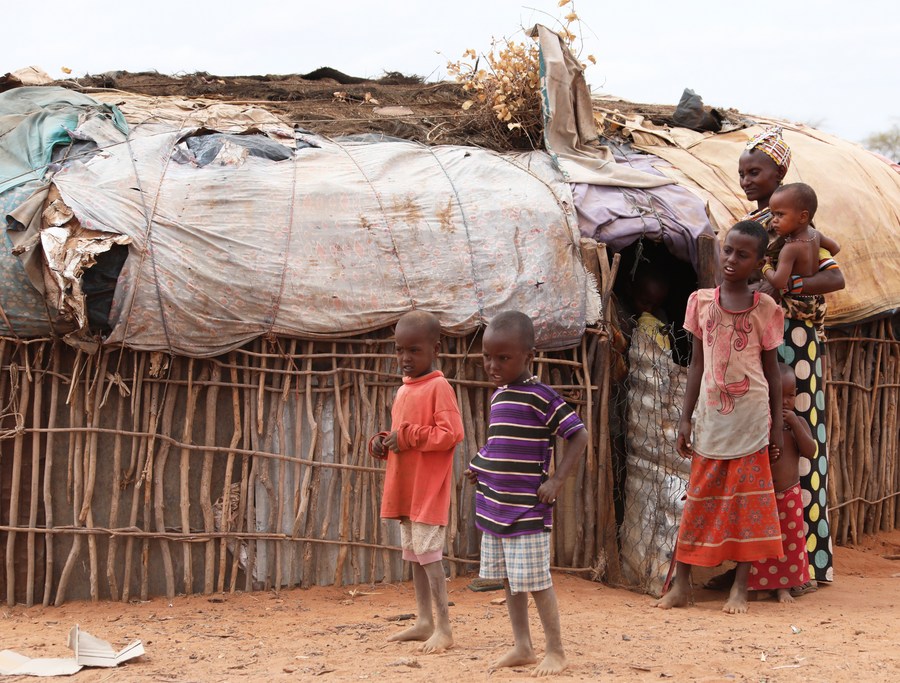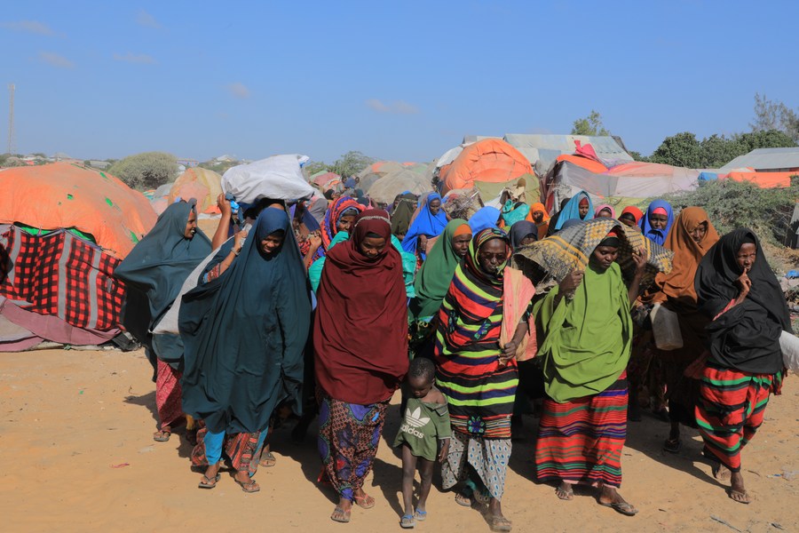 People were seen at a camp on the outskirts of Mogadishu, capital of Somalia, on Feb. 4, 2022. (Photo by Hassan Bashi/Xinhua)