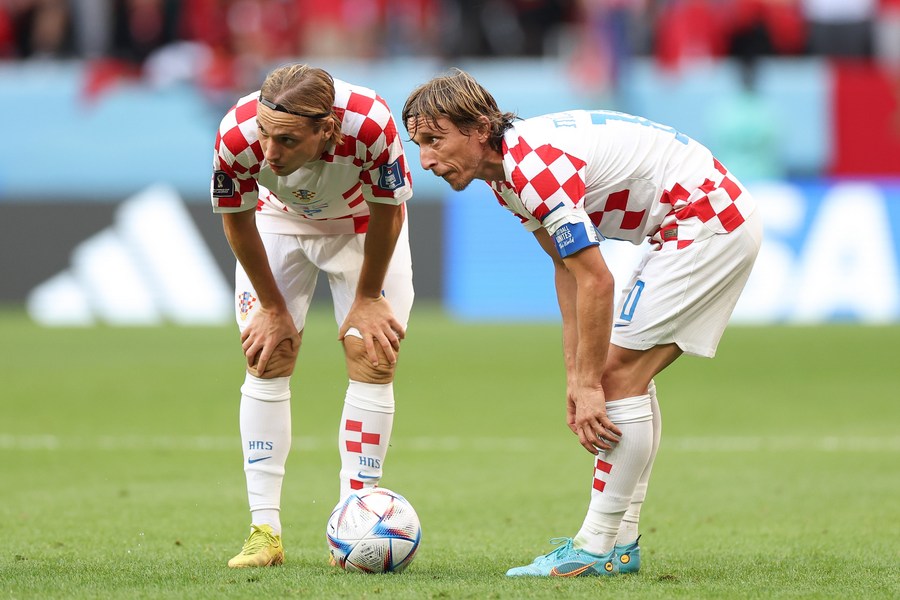 Luka Modric (R) and Lovro Majer of Croatia react before taking a freekick during the Group F match between Morocco and Croatia at the 2022 FIFA World Cup at Al Bayt Stadium in Al Khor, Qatar, Nov. 23, 2022. (Xinhua/Jia Haocheng)