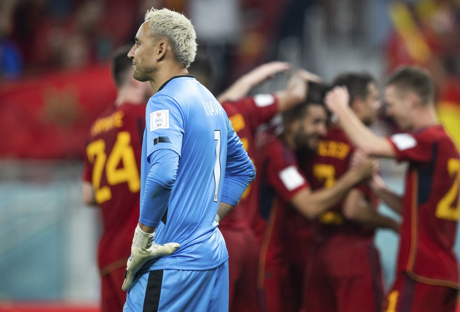 Keylor Navas, goalkeeper of Costa Rica, reacts during the Group E match between Spain and Costa Rica at the 2022 FIFA World Cup at Al Thumama Stadium in Doha, Qatar, Nov. 23, 2022. (Xinhua/Xiao Yijiu)