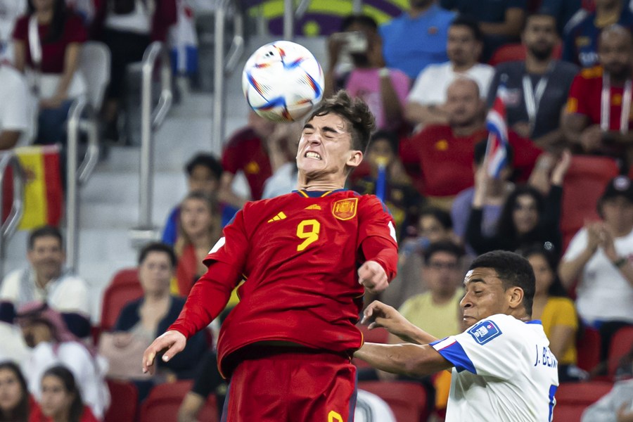 Gavi (L) of Spain heads for the ball during the Group E match between Spain and Costa Rica at the 2022 FIFA World Cup at Al Thumama Stadium in Doha, Qatar, Nov. 23, 2022. (Xinhua/Xiao Yijiu)