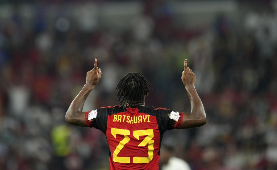 Michy Batshuayi of Belgium celebrates during the Group F match between Belgium and Canada at the 2022 FIFA World Cup at Ahmad Bin Ali Stadium in Al Rayyan, Qatar, Nov. 23, 2022. (Xinhua/Meng Dingbo)