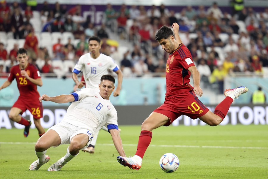 Marco Asensio of Spain shoots during the Group E match between Spain and Costa Rica at the 2022 FIFA World Cup at Al Thumama Stadium in Doha, Qatar, Nov. 23, 2022. (Xinhua/Li Ming)