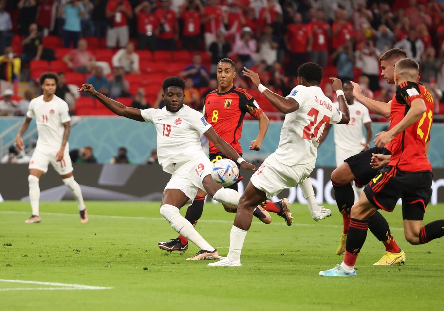 Alphonso Davies of Canada (2nd L) competes during the Group F match between Belgium and Canada at the 2022 FIFA World Cup at Ahmad Bin Ali Stadium in Al Rayyan, Qatar, Nov. 23, 2022. (Xinhua/Han Yan)