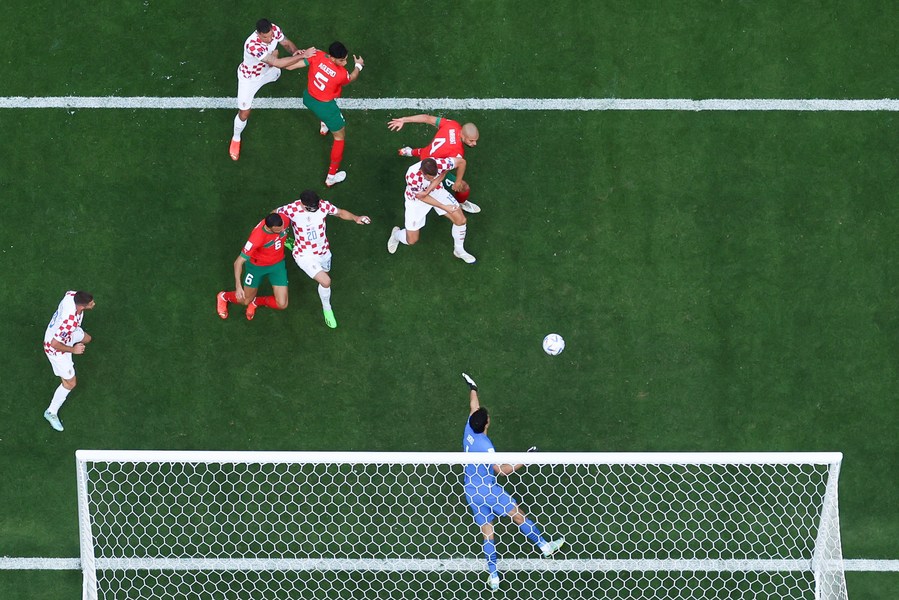 Achraf Hakimi (top R) of Morocco vies for a header during the Group F match between Morocco and Croatia at the 2022 FIFA World Cup at Al Bayt Stadium in Al Khor, Qatar, Nov. 23, 2022. (Xinhua/Zheng Huansong)