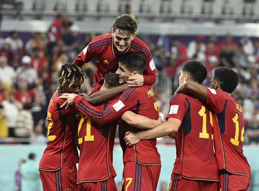 Players of Spain celebrate after scoring during the Group E match between Spain and Costa Rica at the 2022 FIFA World Cup at Al Thumama Stadium in Doha, Qatar, Nov. 23, 2022. (Xinhua/Li Ga)