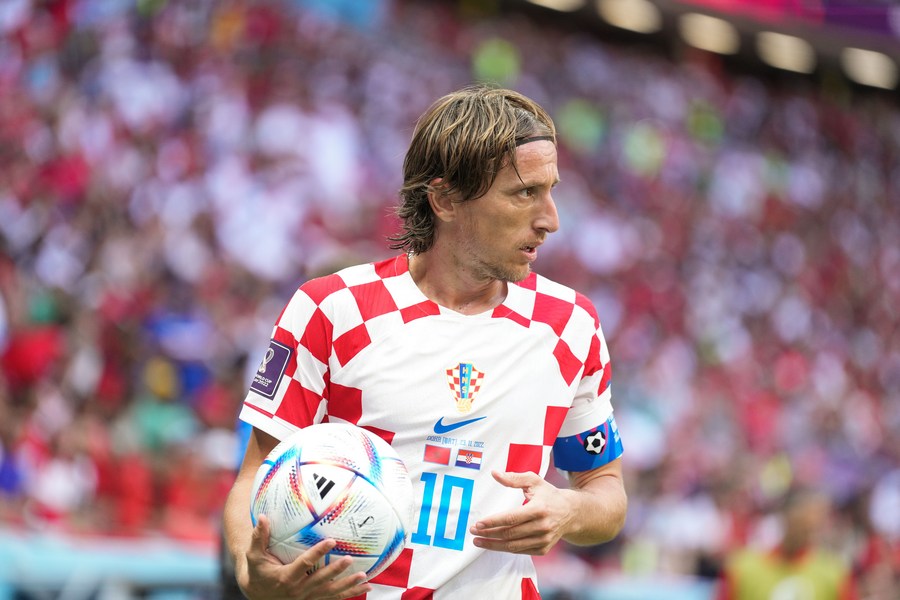 Luka Modric of Croatia reacts during the Group F match between Morocco and Croatia at the 2022 FIFA World Cup at Al Bayt Stadium in Al Khor, Qatar, Nov. 23, 2022. (Xinhua/Zheng Huansong)