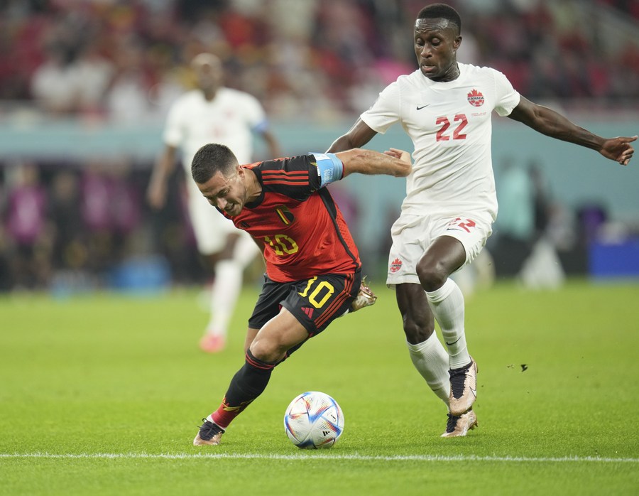 Eden Hazard (L) of Belgium vies with Richie Laryea of Canada during the Group F match between Belgium and Canada at the 2022 FIFA World Cup at Ahmad Bin Ali Stadium in Al Rayyan, Qatar, Nov. 23, 2022. (Xinhua/Meng Dingbo)