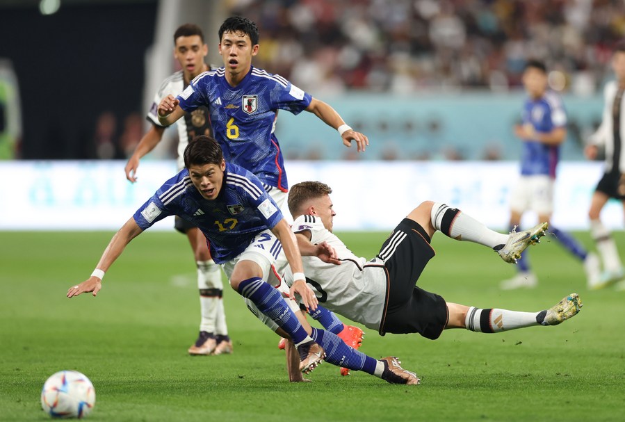 Joshua Kimmich (R) of Germany falls down after vying with Sakai Hiroki (L) of Japan during the Group E match between Germany and Japan at the 2022 FIFA World Cup at Khalifa International Stadium in Doha, Qatar, Nov. 23, 2022. (Xinhua/Pan Yulong)