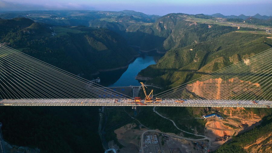 Aerial photo taken on Aug. 19, 2022 shows the construction site of the Longli River bridge in Longli County, southwest China's Guizhou Province. (Xinhua/Yang Wenbin)