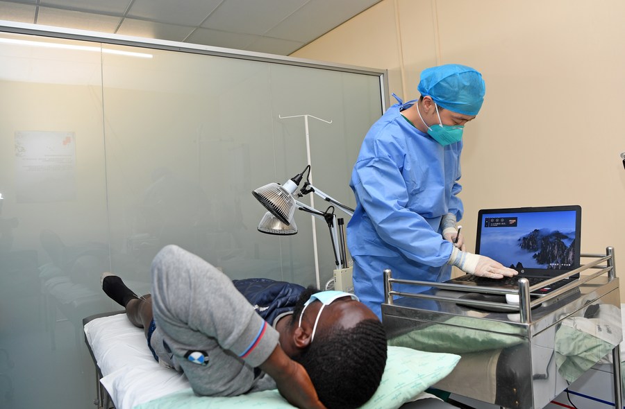 Chinese doctor Zhou Haijiang conducted acupuncture therapy and Chinese Medicine Music Therapy for a patient at the Katutura State Hospital in Windhoek, Namibia, on June 17, 2022. (Xinhua/Chen Cheng)